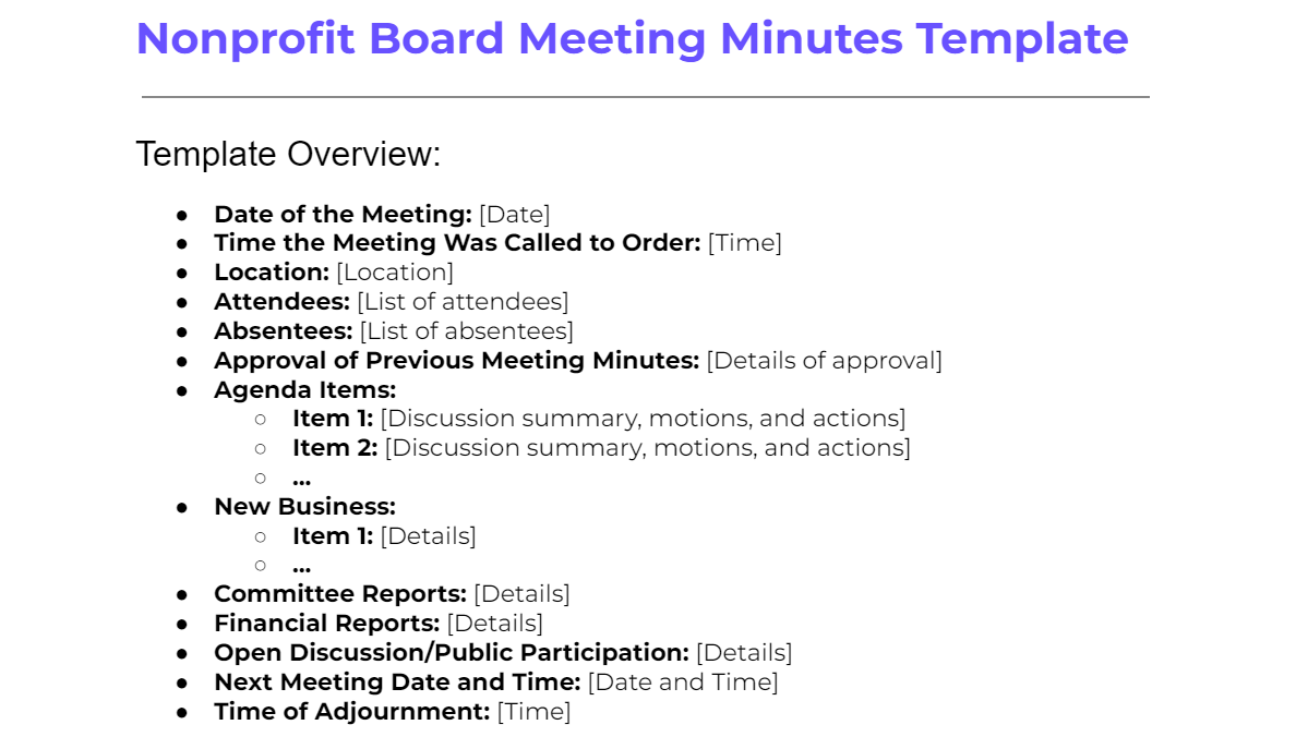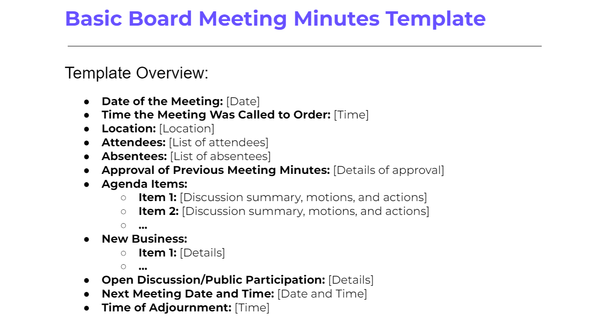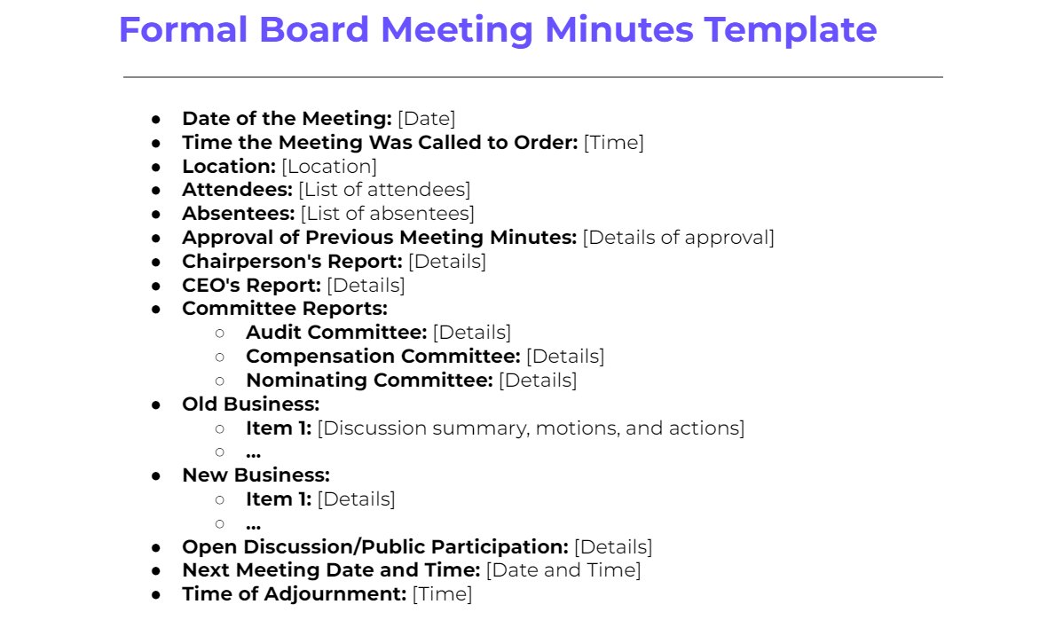 您可以从这种结构开始,并根据会议类型(无论是非营利委员会、初创公司领导团队还是公司治理委员会)调整各个部分。