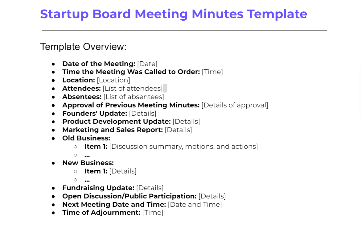下载 .docx (Word) 文件形式的初创公司董事会会议纪要模板。