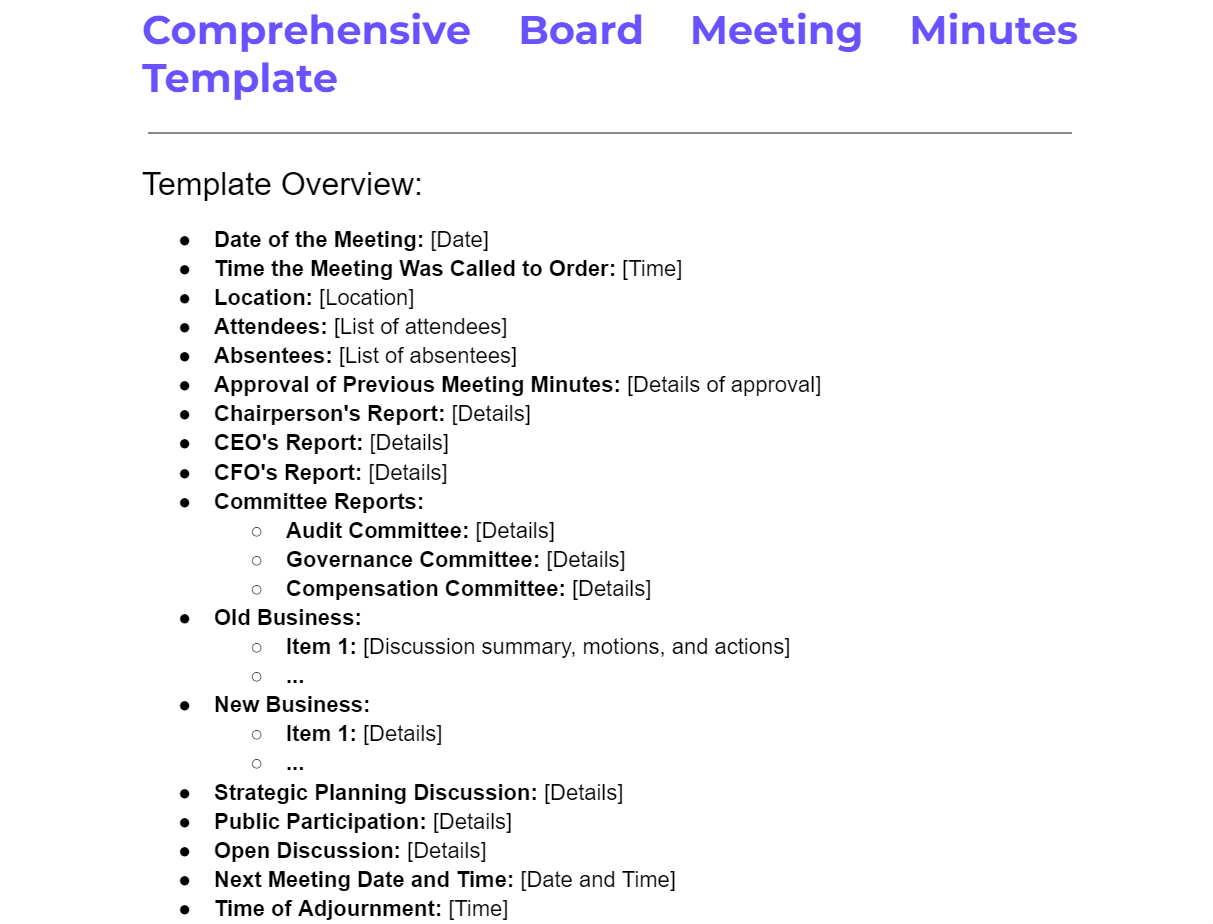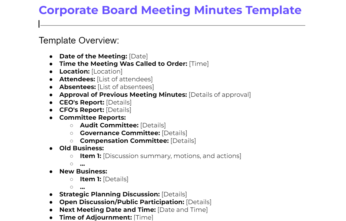 董事会会议记录是董事会会议期间讨论、决定和采取的行动的正式记录。它们具有多种基本目的,包括法律合规性、治理和历史参考。