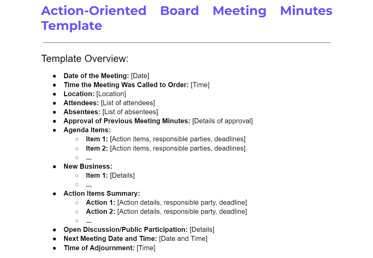 下载 .docx (Word) 文件形式的面向行动的董事会会议纪要模板。