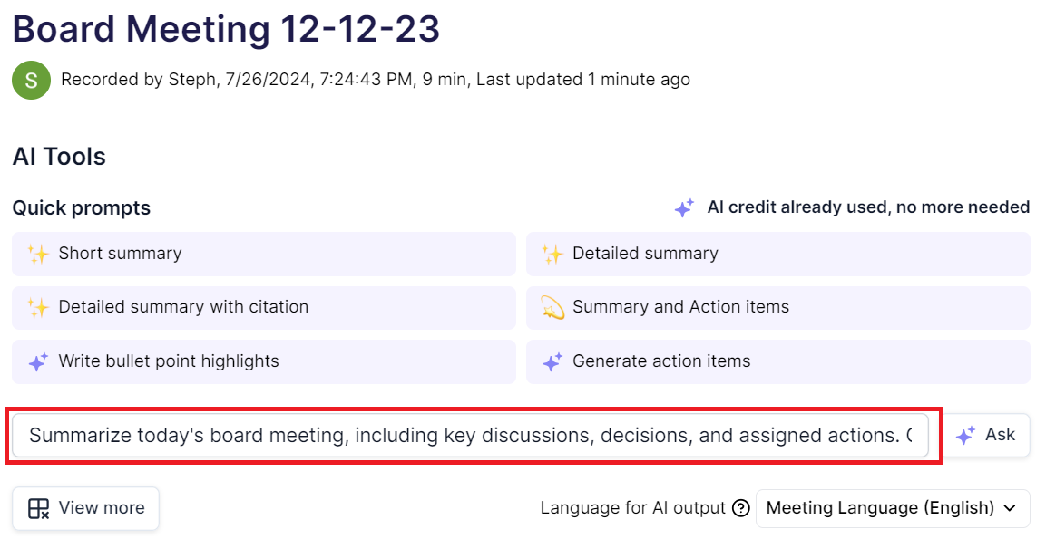 - 自定义人工智能提示:使用保存的提示立即将记录转变成结构化的会议纪要。