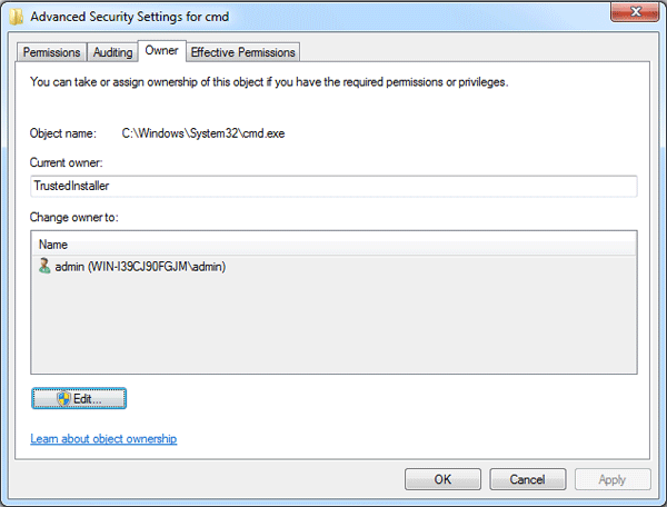 - 在“高级安全设置”对话框中,单击所有者选项卡,它将指示当前所有者为 TrustedInstaller 或其他用户帐户。