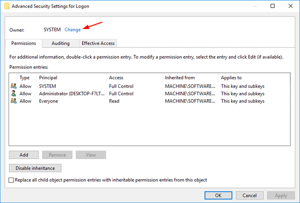 - 在“高级安全设置”对话框中,您可以看到所选密钥的当前所有者(SYSTEM 或“TrustedInstaller”)。点击改变按钮。