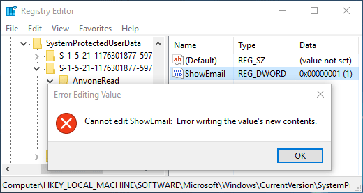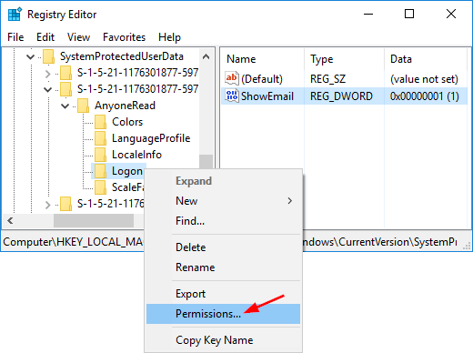 HKEY_LOCAL_MACHINE\SOFTWARE\Microsoft\Windows\CurrentVersion\SystemProtectedUserData\S-1-5-21-1176301877-597599738-4051979053-1001\AnyoneRead\Logon - 右键单击受保护的密钥,然后选择权限从出现的上下文菜单中。