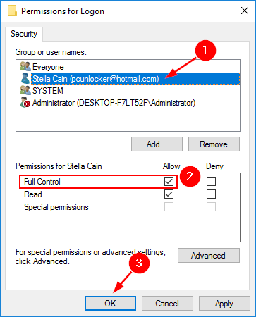 - 返回到权限窗口时,选择所需的用户名,然后检查允许下的复选框完全控制行,然后单击好的。