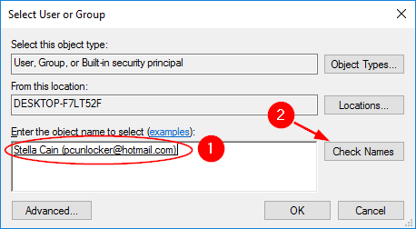 - 这将打开一个新对话框。现在输入您的用户帐户名,然后单击“检查姓名”按钮将用户名转换为正确的格式。单击好的。