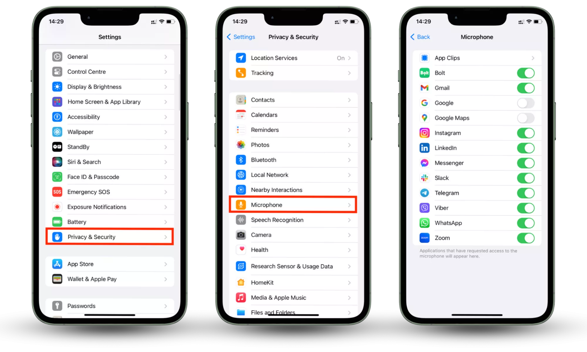 步骤 1-3:转到“设置”>“隐私和安全”,然后检查“相机”和“麦克风”下的应用程序。