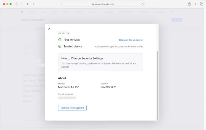 步骤 4。在弹出窗口中,滚动浏览所有设备信息部分,然后单击从帐户中删除。