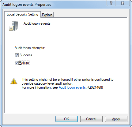 当登录事件属性窗口打开时,检查成功和失败审计所有类型的帐户登录活动。点击申请保存您的更改。