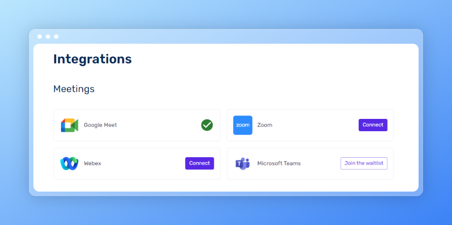 - 选择“整合”选项卡,然后连接您喜欢的视频会议工具(Zoom、Google Meet 或 Microsoft Teams)。