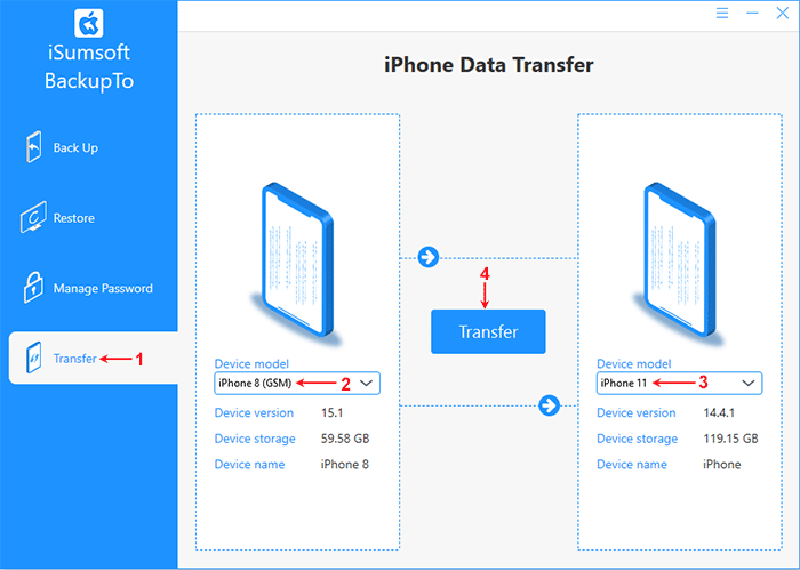 在电脑上打开 iSoft BackupTo,然后选择转移左侧边栏上的选项。在左侧虚线框中的下拉菜单中,选择要从中传输数据的 iPhone 作为源 iPhone。在右侧虚线框的下拉菜单中,选择另一部iPhone作为目标iPhone。确认您的 iPhone 后,单击转移。