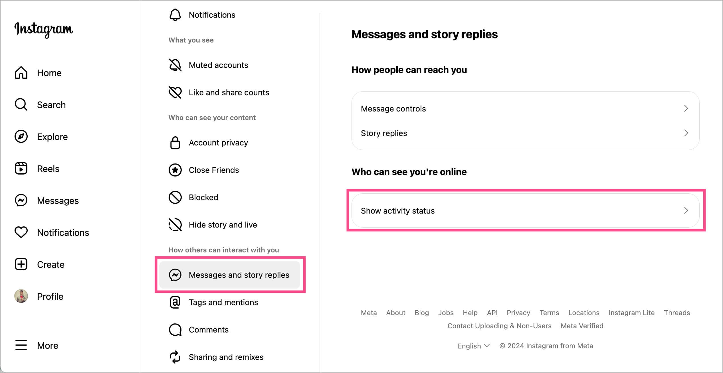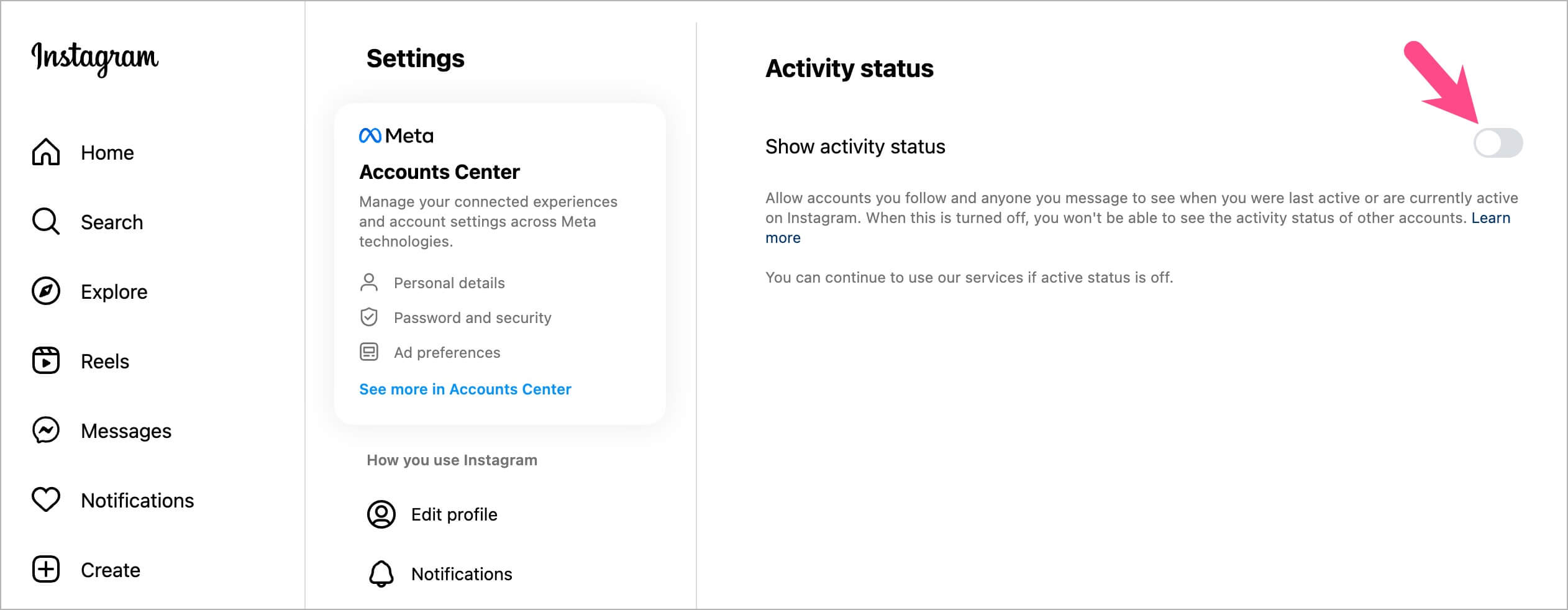 或者,您可以直接访问https://www.instagram.com/accounts/how_others_can_interact_with_you/并关闭“显示活动状态”。