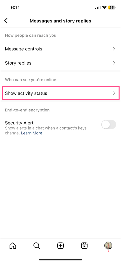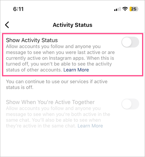 笔记:对活动状态所做的任何更改都会影响您的 Instagram 帐户登录的其他设备。