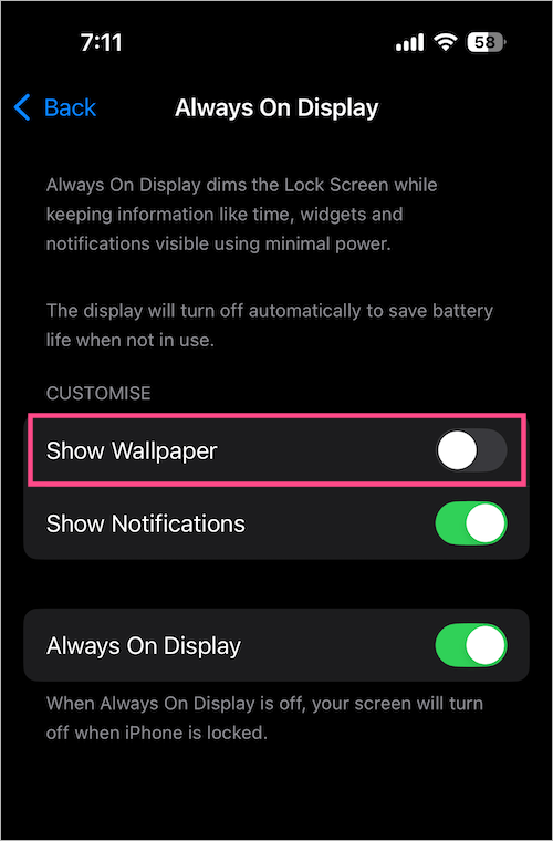 如果您愿意,您可以保持锁定屏幕的暗色版本可见,同时隐藏常亮显示屏上的壁纸。为此,只需关闭“显示壁纸” 切换。