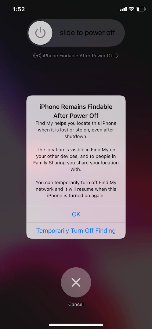 提示: 可以访问紧急求救模式从电源关闭屏幕和关闭“查找我的网络”暂时这样您的 iPhone 在关机后仍无法被追踪。
