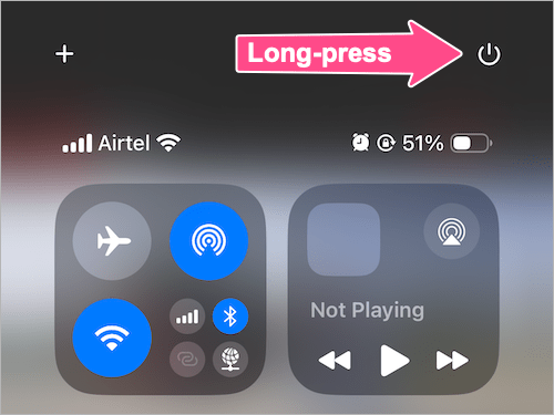 为此,请从右上角向下滑动以打开控制中心。然后 '点击并按住' 右上角的电源图标。从左向右滑动电源关闭滑块以关闭设备。
