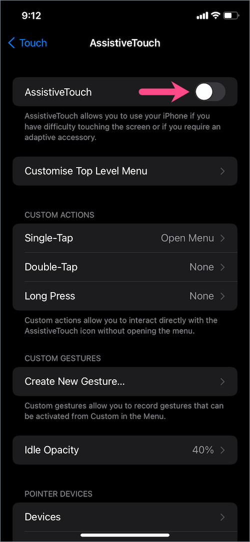 - 点击顶部的“AssistiveTouch”,然后打开 AssistiveTouch 旁边的开关。