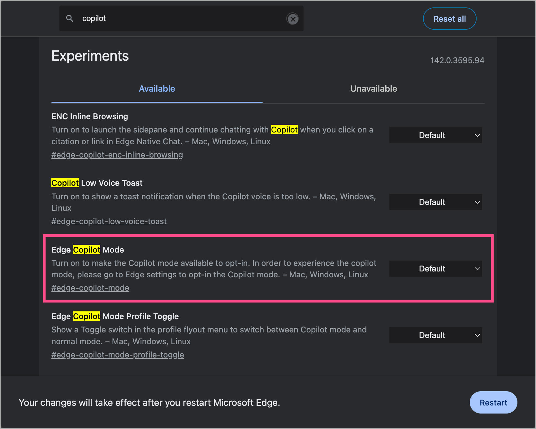 - 点击重新启动重新启动 Edge 并使更改生效。