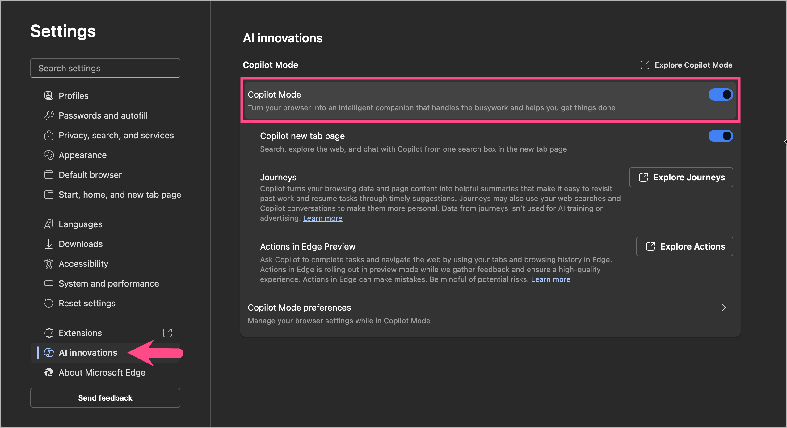 - 选择人工智能创新从左侧边栏访问 Copilot 设置。