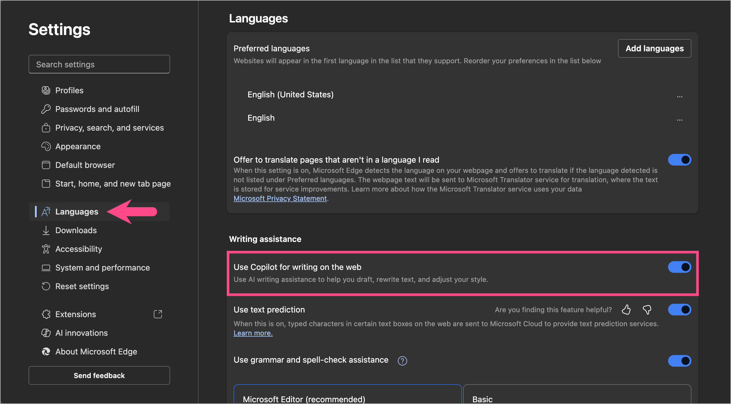 Edge 包含由 Copilot 提供支持的内置 AI 写作帮助。要在 Microsoft Edge 中禁用 Copilot AI 书写帮助,请执行以下操作: