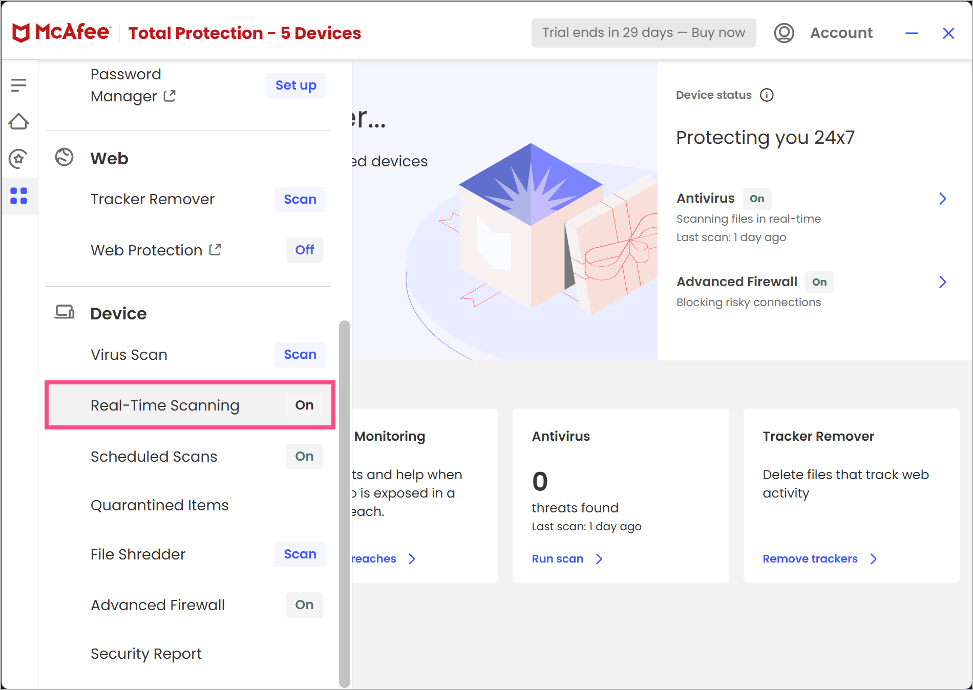 实时扫描不断检查文件和应用程序是否存在威胁。以下是关闭 McAfee Antivirus 实时保护的方法: