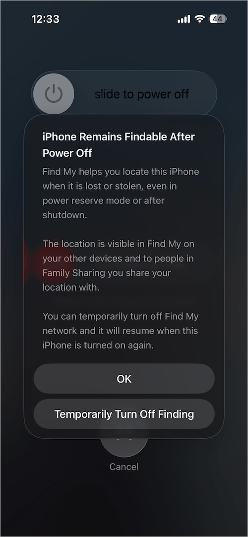 提示:您还可以在同一屏幕上触发紧急求救或暂时禁用查找我的网络以便您的 iPhone 在关机后仍无法被追踪。