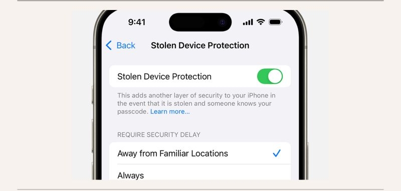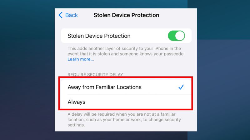 例如,如果您启用该功能仅在以下情况下应用远离熟悉的地点,那么仅当您位于 iPhone 无法识别的地方(在家、办公室或受信任位置之外)时,一小时延迟才会激活。相反,如果您将其设置为需要延迟总是,无论您身在何处,它每次都会发挥作用。
