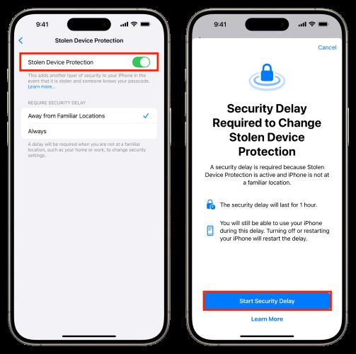 步骤 4。经过身份验证后,您将看到一条消息,指出更改被盗设备保护需要安全延迟。点击启动安全延迟按钮开始倒计时。