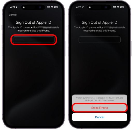 步骤 4。输入您的苹果ID密码当出现提示时。这将验证您是合法所有者并授权设备重置。如果询问是否删除或保留 eSIM,请做出选择。