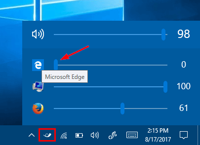 安装后,您将在 Windows 10 的通知区域(靠近屏幕右下角)中看到一个小喇叭图标。单击此图标,您可以查看和控制 Windows 10 中运行的不同应用程序的音量级别。