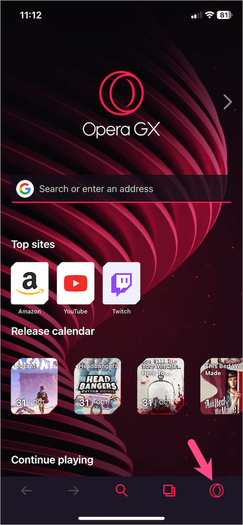 - 打开 Opera GX 应用程序并点击歌剧图标在右下角。