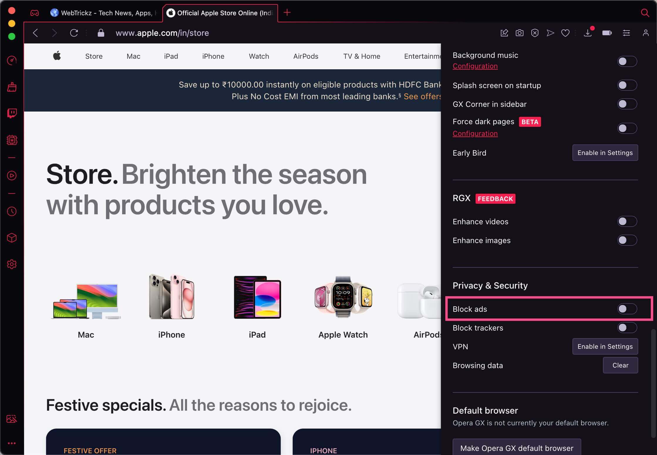 Opera GX 的广告拦截器是默认关闭除非您在初始设置期间启用它。