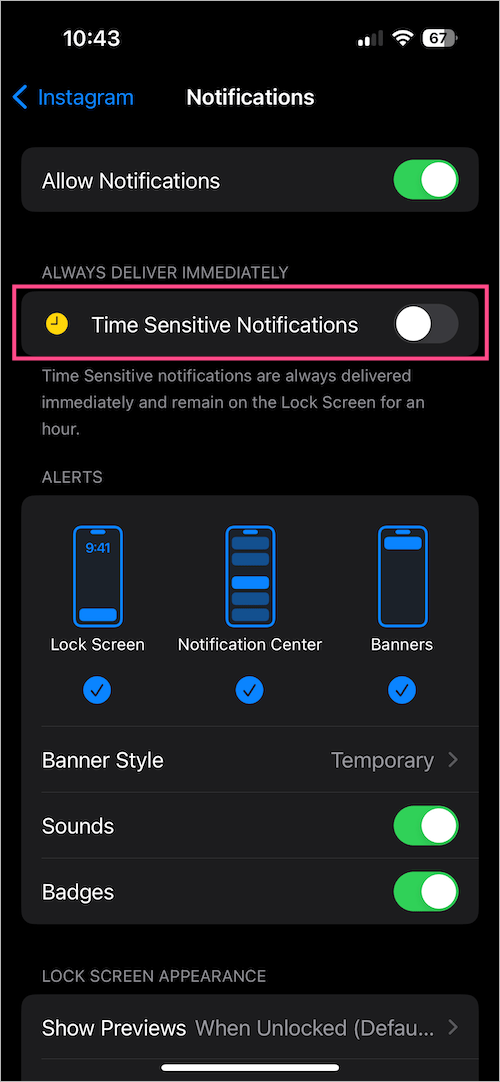 不用担心,iOS有一个方便的选择,可以禁用单个应用程序的时间敏感通知。这样,您可以阻止Instagram发送时间敏感通知。