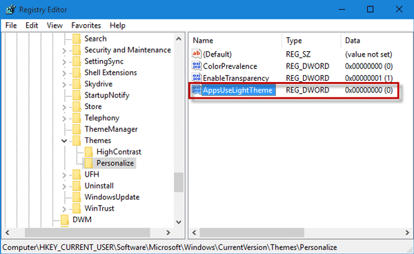 如果你想关闭深色主题模式,只需删除AppsUseLightTheme值或更改其数据“0“ 到 ”1”。
