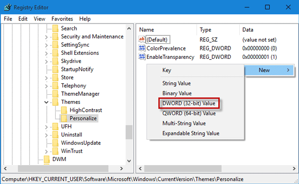 步骤 2:在注册表编辑器中,展开HKEY_CURRENT_USERSOFTWAREMicrosoftWindowsCurrentVersionThemes个性化。右键单击右侧窗格的任意空白区域,指向新的并选择DWORD(32 位)值创建新的 32 位 DWORD 值。