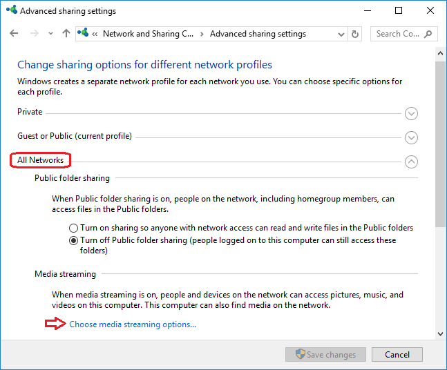 - 要启用媒体流和其他选项,请选择“所有网络” 输入并单击“选择媒体流选项”如下图所示。