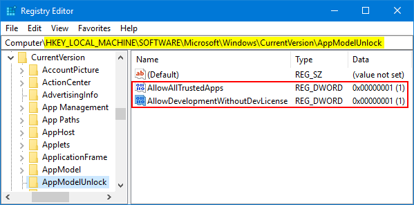 HKEY_LOCAL_MACHINE\SOFTWARE\Microsoft\Windows\CurrentVersion\AppModelUnlock - 右键单击右侧窗格中的空白区域,然后创建两个 DWORD(32 位)值:允许所有受信任的应用程序,允许在没有 DevLicense 的情况下进行开发。根据您的选择设置关联的值数据。