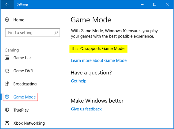 选择游戏模式左侧窗格中的选项卡。您应该会看到一条文字:“此电脑支持游戏模式”。