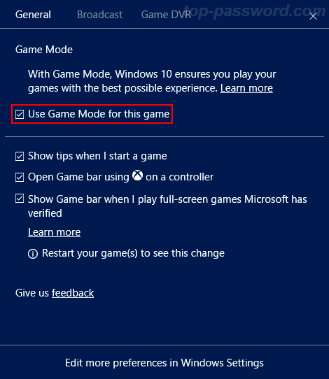 在下一个打开的屏幕中,选中标有“使用此游戏的游戏模式“。如果您想稍后禁用游戏模式,只需取消选中该框即可。