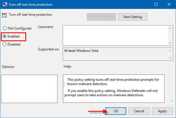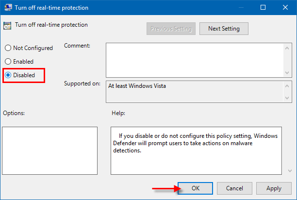 当恶意软件或可能不需要的软件尝试自行安装或在您的计算机上运行时,Windows Defender 会向您发出警报。到启用实时保护: 选择未配置或者残疾人,点击好的。 Windows Defender 将提示用户对检测到的恶意软件采取措施。