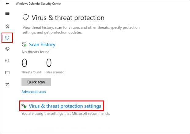 第 2 步:点击病毒威胁防护左侧菜单栏上的图块。点击病毒和威胁防护设置。