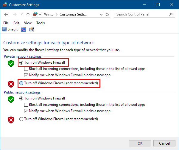 第 3 步:切换Windows 防火墙切换到在或者离开对于你想要设置的内容。