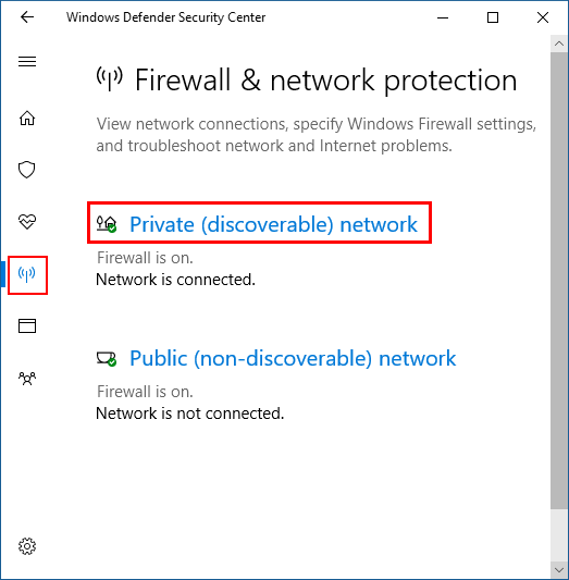 第 2 步:单击/点击防火墙和网络保护左侧菜单栏上的图块。在下面选择一个网络配置文件Windows 防火墙。