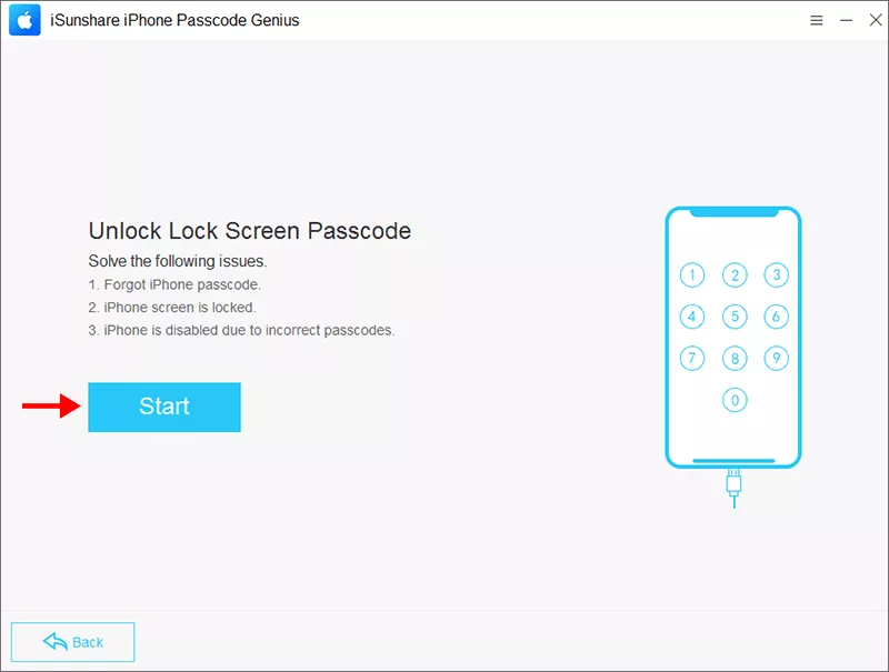 步骤1:在计算机上启动 iSunshare iPhone Passcode Genius 并将 iPhone 连接到计算机。在软件主页上,选择“解锁锁屏” 继续。
