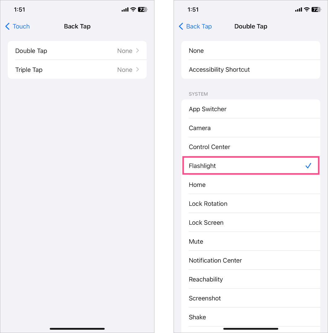 - 打开“双击”并选择手电筒在系统类别下。您还可以将手电筒分配给“三次点击”操作。
