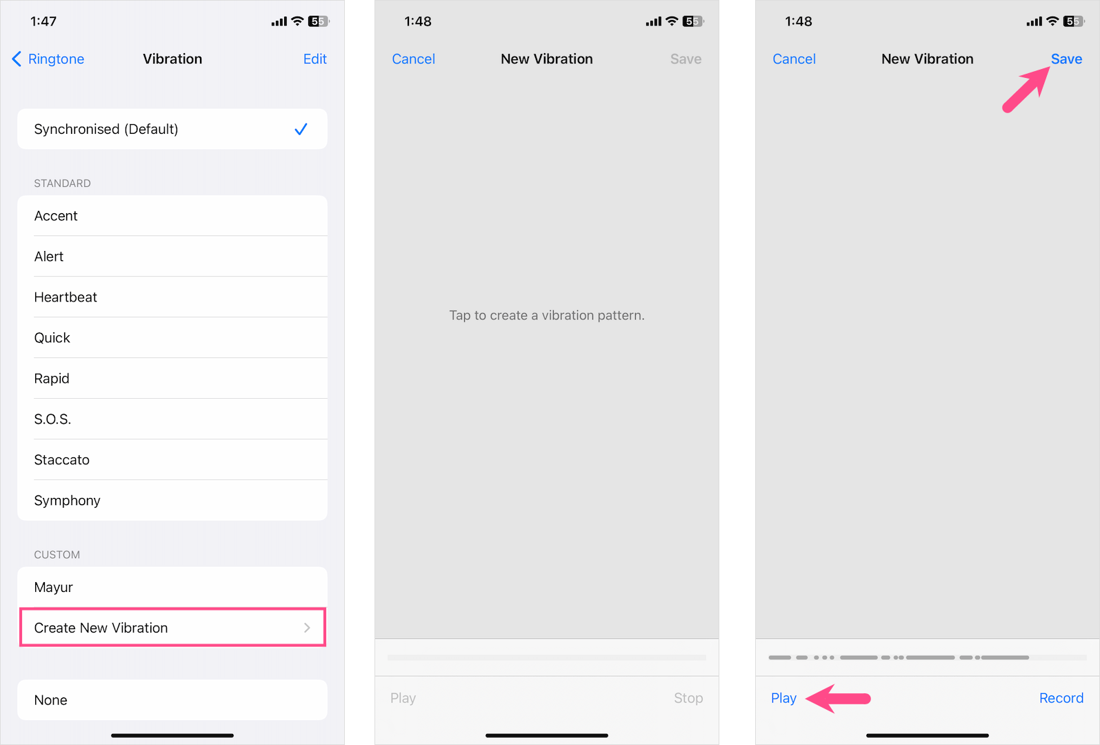创造你自己的振动, 轻敲 '创造新的振动' 在自定义部分下。然后点击屏幕记录您认为强烈且更明显的模式。
