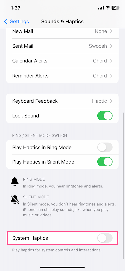 禁用系统触觉,转到“设置”>“声音和触觉”。滚动到底部并关闭“系统触觉”旁边的开关。