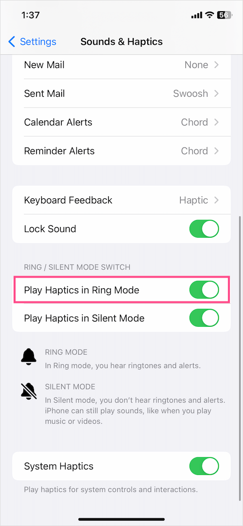 要为电话和提醒启用振动,请转至“设置”>“声音和触觉”。向下滚动并打开“在环形模式下发挥触觉”。