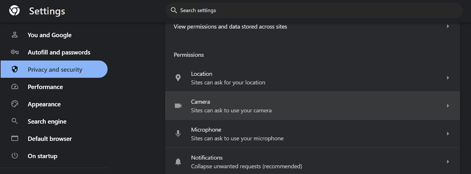 - 转到站点权限:在左侧侧边栏中,单击“ cookie和站点权限”。
