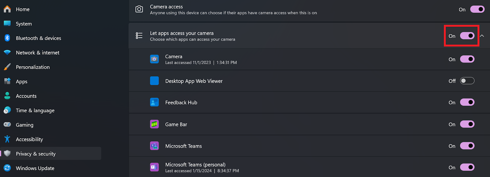 - 应用程序权限:向下滚动以确保像您的Web浏览器这样的单个应用程序使切换打开以供摄像机访问。